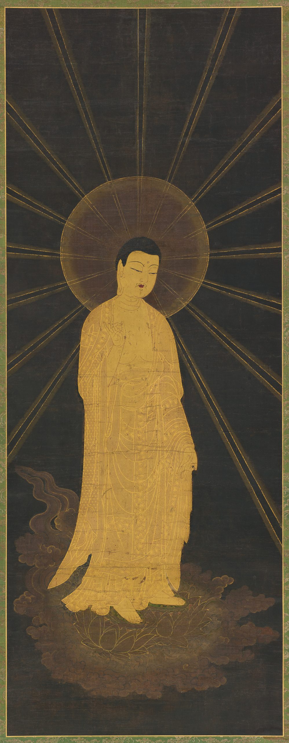“Al oeste de nuestro mundo, más allá del bhakti de los diez billones de budas, existe un mundo llamado Dicha Última. En la Tierra de la Dicha Última vive un Buda, cuyo nombre es Amitabha, que habla el Dharma. Se llama el mundo de la dicha porque la gente de ese reino de Buda no sufre, sino que sólo disfruta de la felicidad.”
